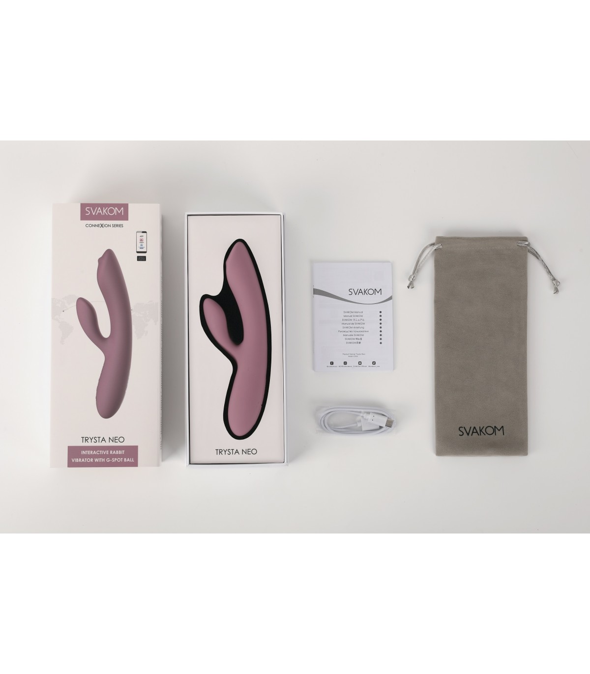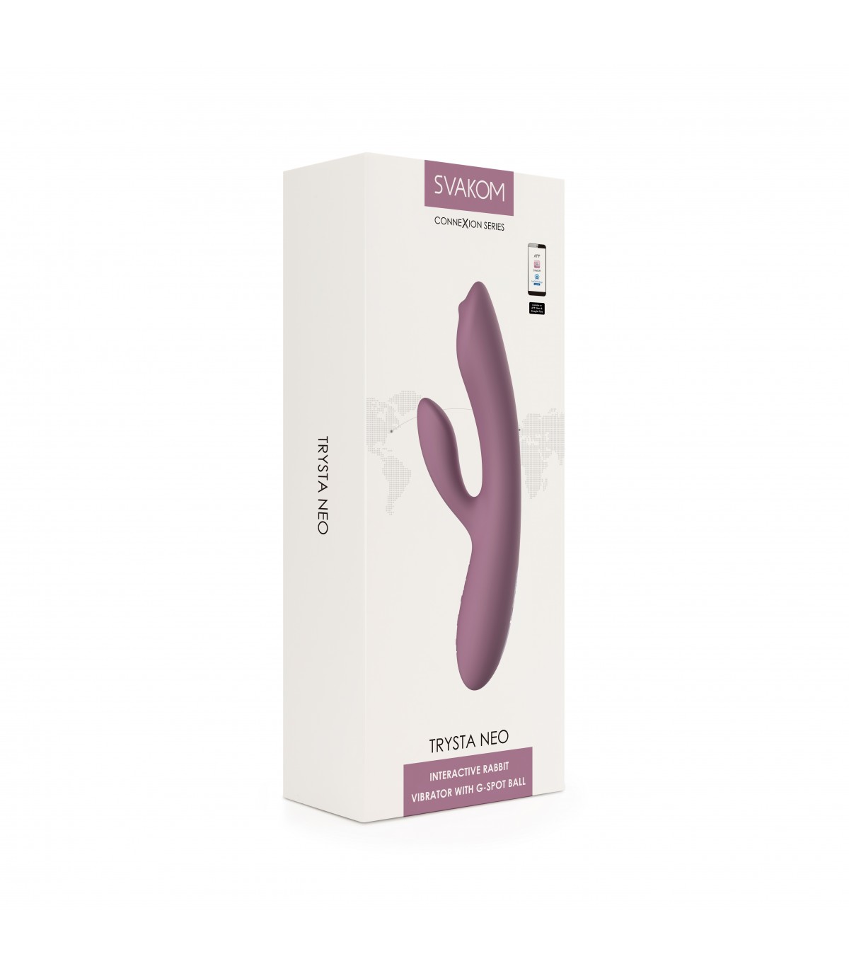 Trysta Neo intensifica el placer del punto G con una bola más firme que se desliza por la cabeza de su eje semirrígido. También incluye un estimulador de clítoris independiente para estimular orgasmos combinados con vibraciones tentadoras. Como parte de la serie Connexion de SVAKOM, Trysta Neo te permite sentir vídeos interactivos para adultos o actuar en plataformas de webcam. También puedes usar Trysta Neo con la aplicación SVAKOM en un smartphone con Bluetooth para disfrutar de la personalización, el control a distancia y el juego en pareja.