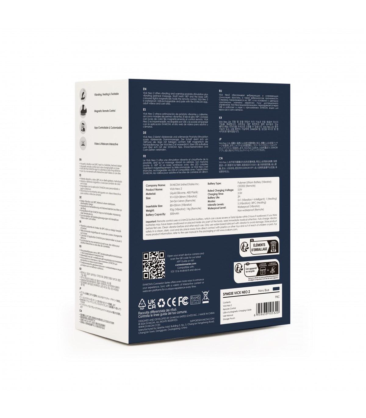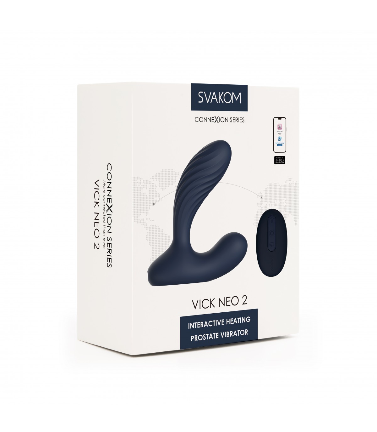 Vick Neo 2 proporciona potentes vibraciones a la próstata y el perineo para un placer doble. El eje texturizado gira 180° y se calienta a 38 °C, mientras que la base tiene luces de colores para cada modo y sujeta magnéticamente el control remoto. Para más opciones, usa Vick Neo 2 con la app SVAKOM y sitios de vídeos para adultos y cámaras compatibles. Características adicionales: Modo Inteligente, diseño resistente al agua, recarga por USB, luces de batería, función de memoria y bloqueo de viaje.