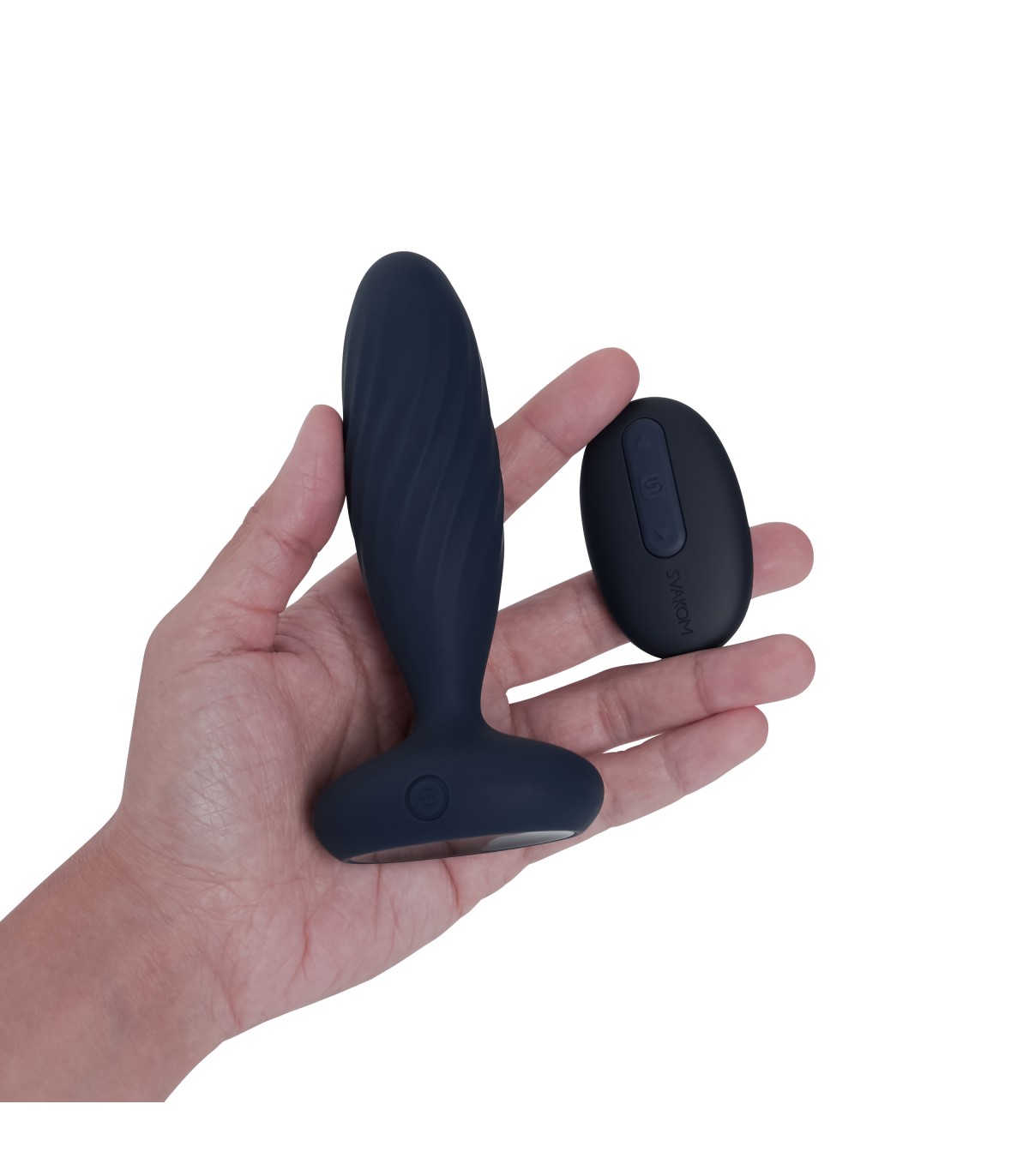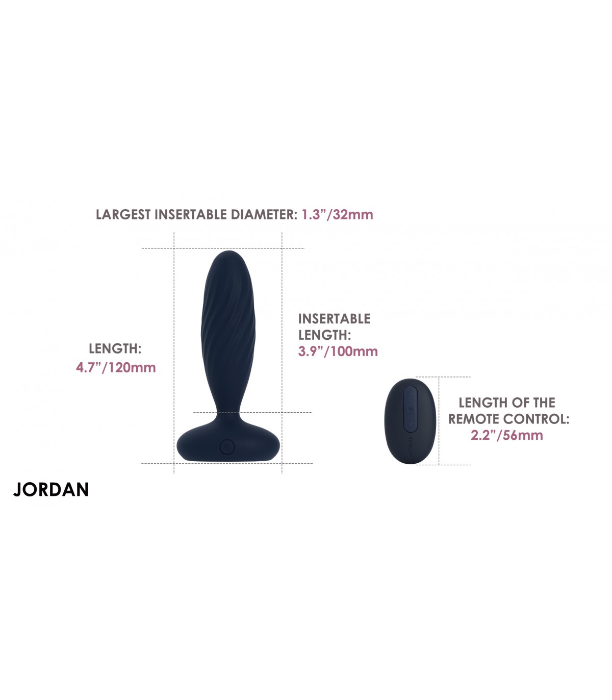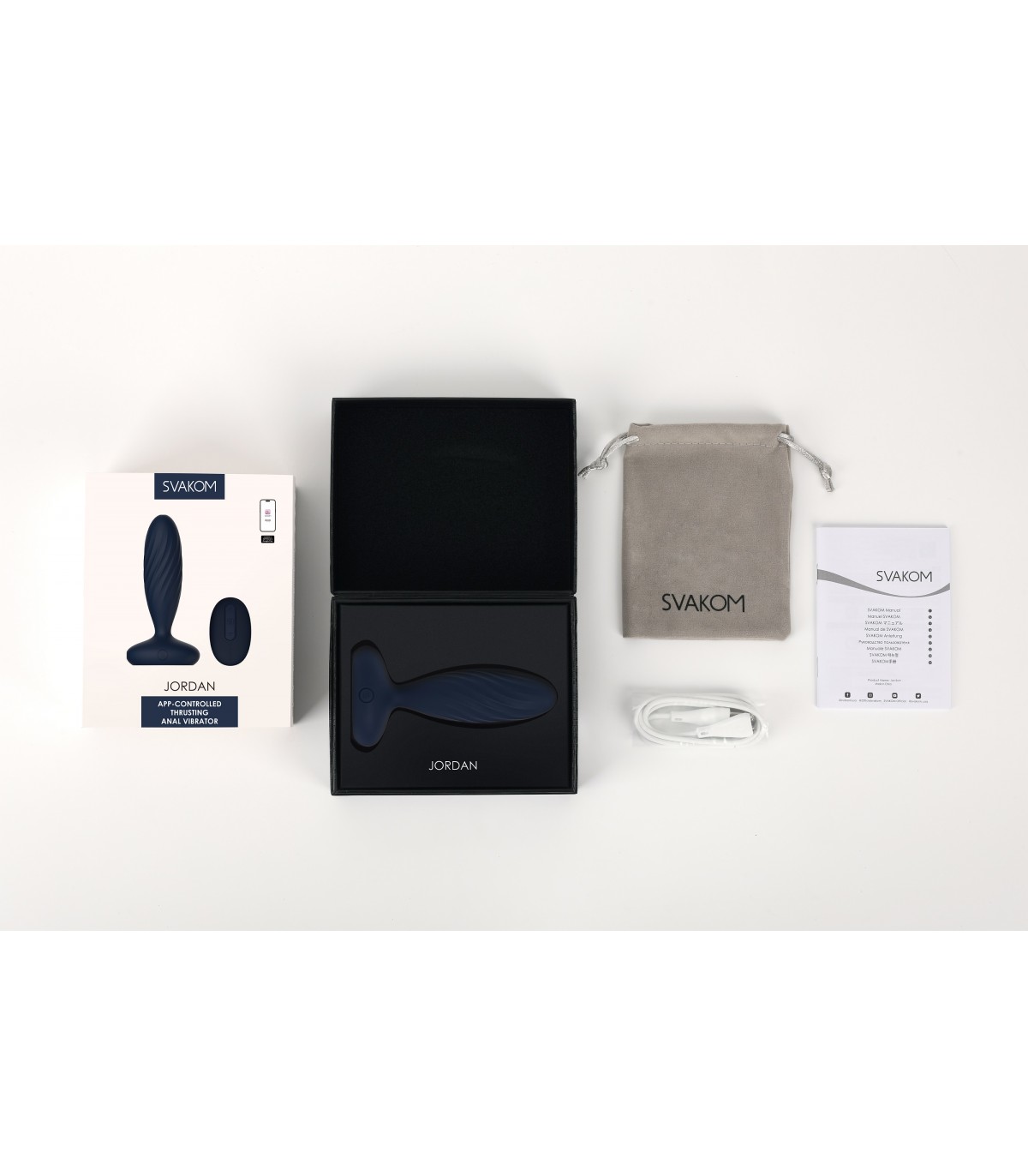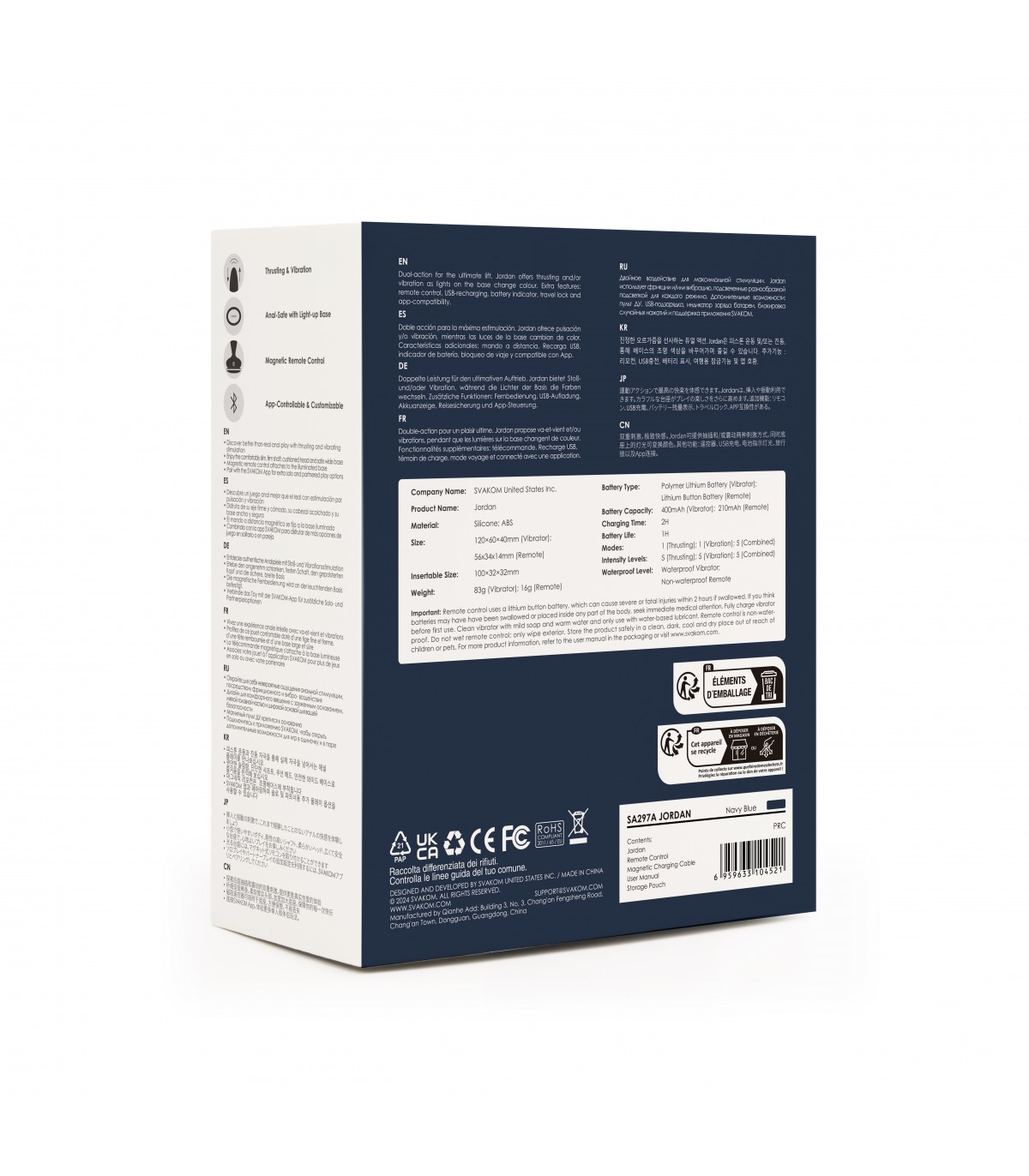 Doble acción para una experiencia de estimulación máxima. Jordan ofrece diferentes intensidades de empuje, vibración y modos combinados, mientras que las luces de la base cambian de color. También cuenta con el Modo Inteligente para imitar los ritmos sexuales. Mientras disfrutas de su cuerpo delgado y firme, cabezal acolchado, cuello estrecho y base ancha y segura, usa el control remoto que se acopla magnéticamente a la base para disfrutar de más opciones de juego o prueba la app SVAKOM. Características adicionales: recarga por USB, indicador de batería y bloqueo de viaje.