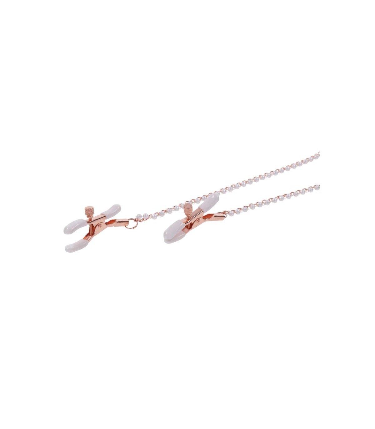 - Herrajes de oro rosa sin níquel con cadena de perlas artificiales blancas.
