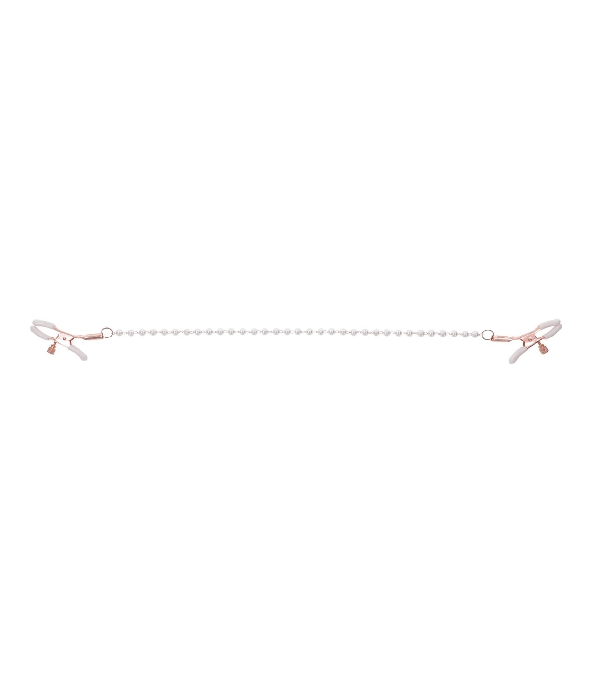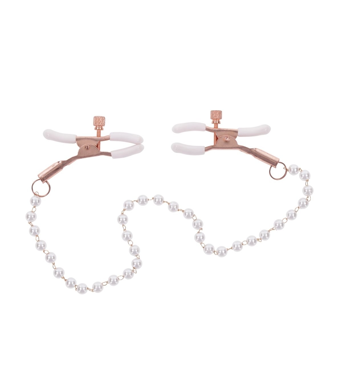 Date un capricho con las pinzas para pezones Peaches n' CreaMe Pearl y sumérgete en sensaciones más profundas. Explora la deliciosa sensibilidad justo donde más la deseas con las pinzas dobles ajustables en un impresionante oro rosa con detalles de perla. Las puntas de goma blanca añaden un toque de color a tus juegos y evitan que las pinzas se deslicen mientras excitas y tiras de la cadena de tu pareja, despertando intensas sensaciones en su cuerpo.