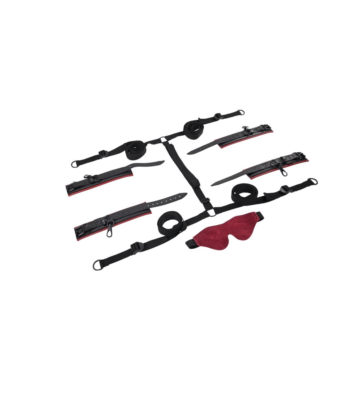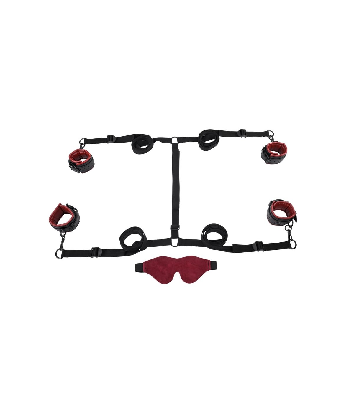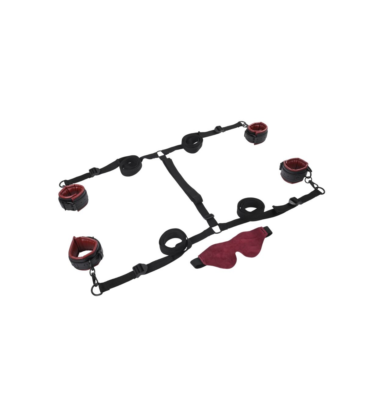 El original (sí, lo inventamos) Sistema de Sujeción Under the Bed® ¡ahora tiene una nueva imagen sensual y seductora! Se instala en minutos y sus atractivos tonos rojos intensos crean un ambiente de lujuria, ideal para los juegos más atrevidos. Cuatro lujosas esposas ajustables de suave y flexible piel sintética con correas de sujeción se fijan a una correa central que se ajusta firmemente debajo del colchón.
