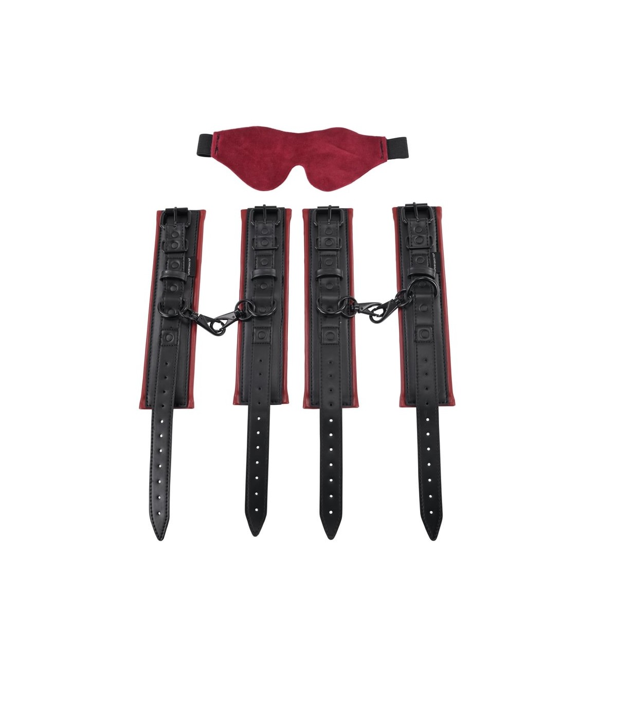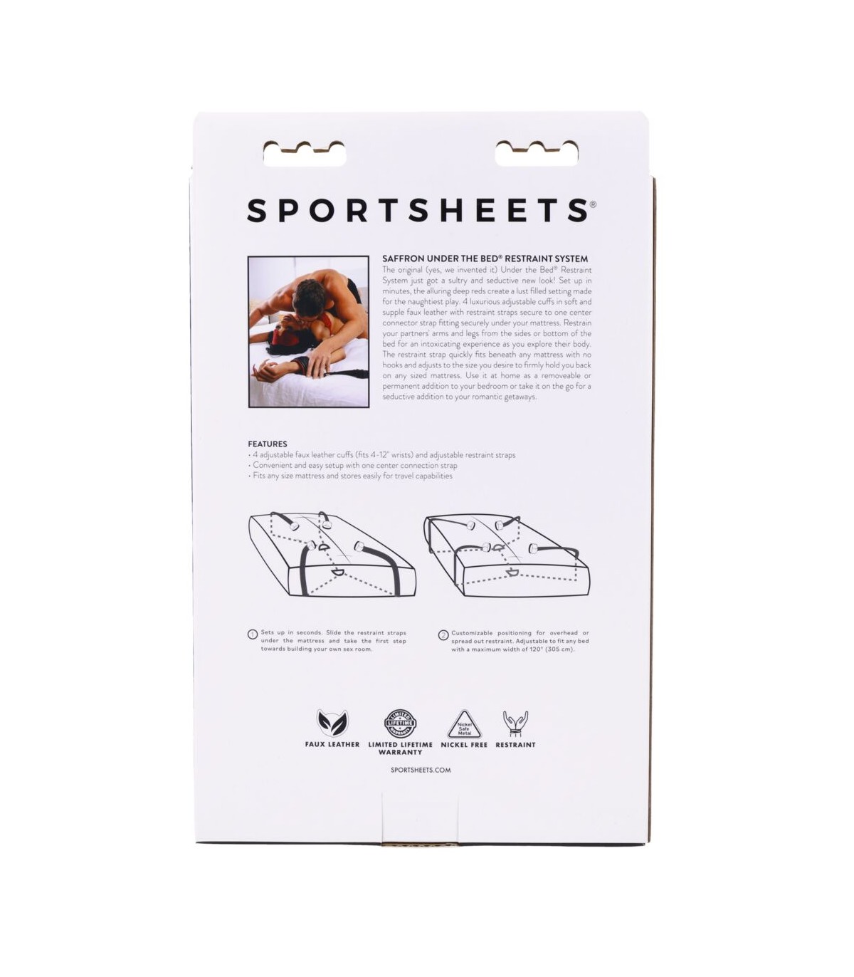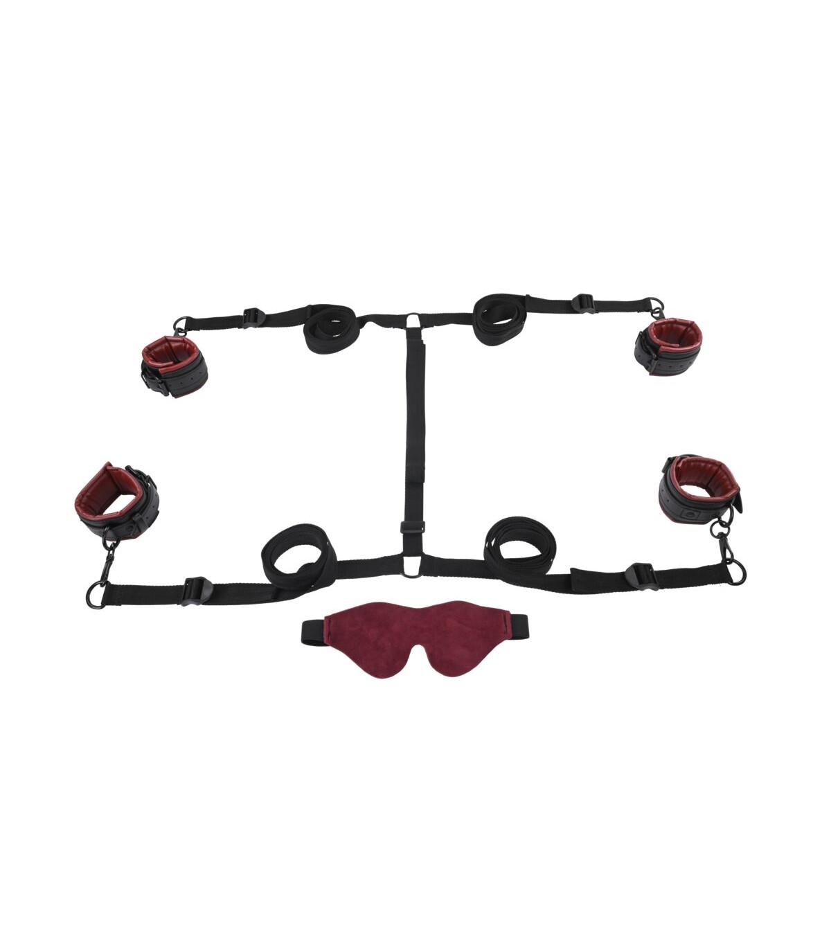 El original (sí, lo inventamos) Sistema de Sujeción Under the Bed® ¡ahora tiene una nueva imagen sensual y seductora! Se instala en minutos y sus atractivos tonos rojos intensos crean un ambiente de lujuria, ideal para los juegos más atrevidos. Cuatro lujosas esposas ajustables de suave y flexible piel sintética con correas de sujeción se fijan a una correa central que se ajusta firmemente debajo del colchón.