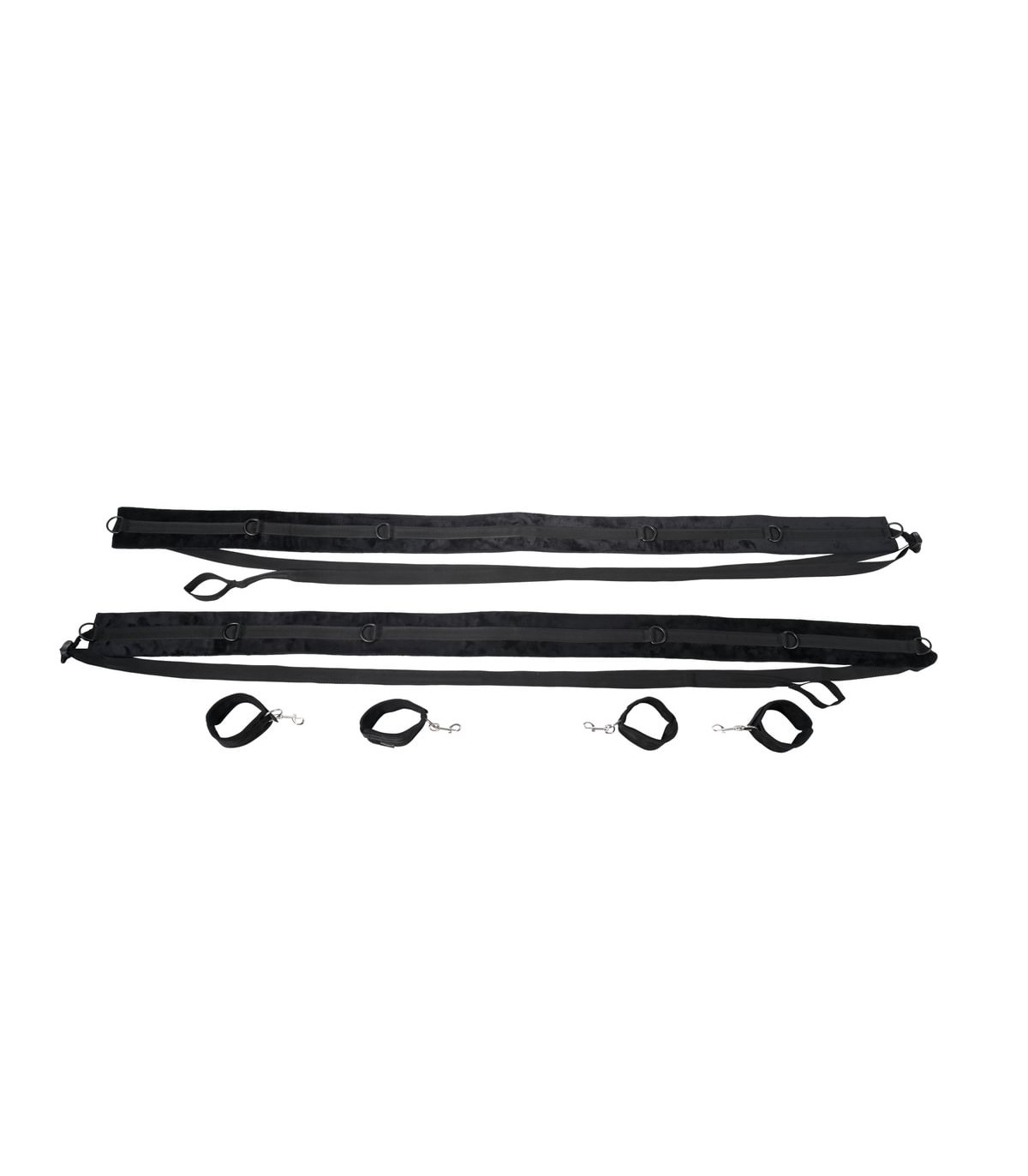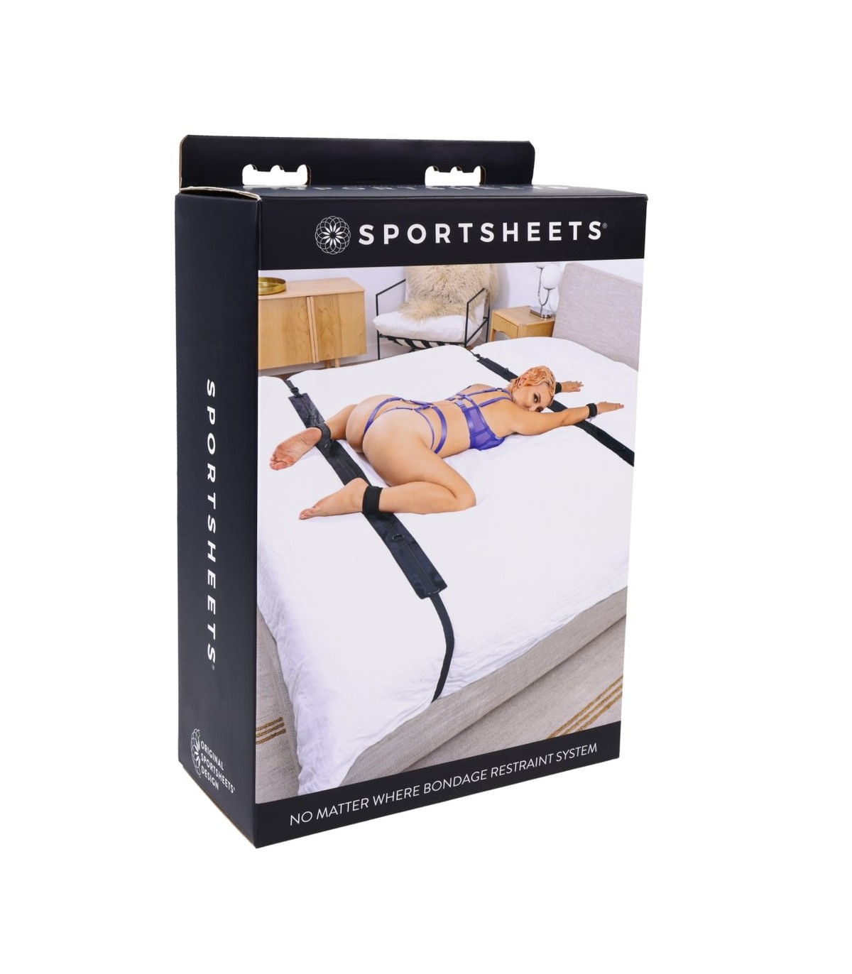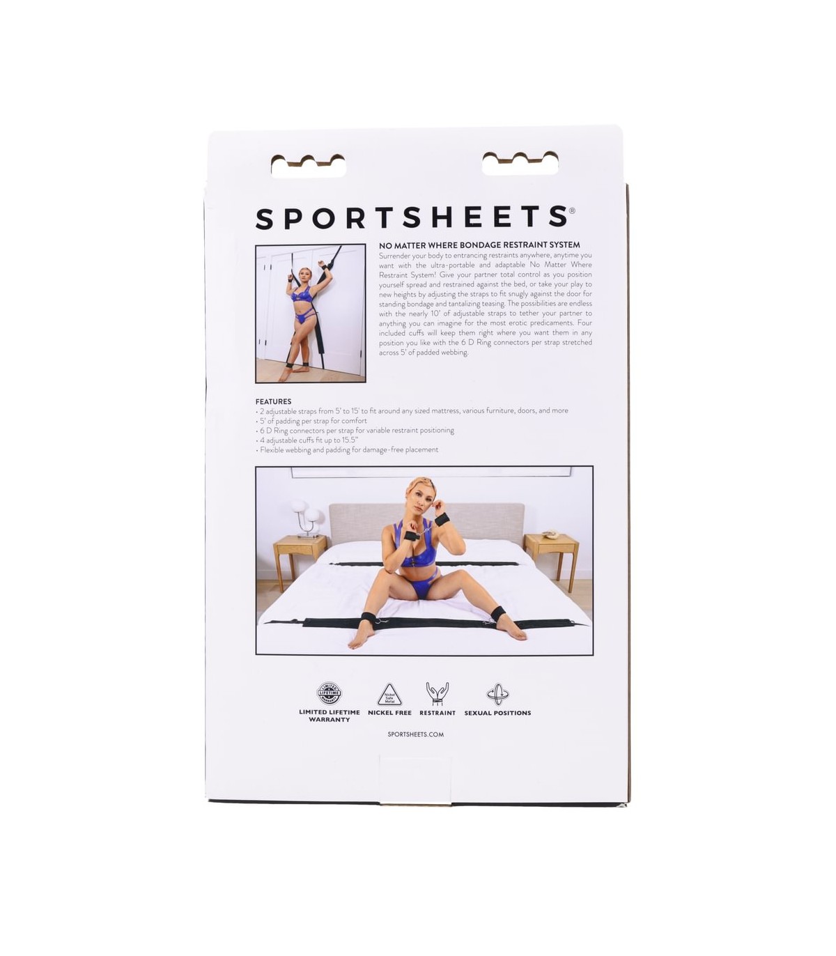 Entregue su cuerpo a fascinantes ataduras donde y cuando quiera con el sistema de sujeción No Matter Where, ultraportátil y adaptable. Dale a tu pareja control total mientras te colocas abierto y sujeto contra la cama, o lleva tu juego a nuevas alturas ajustando las correas para que se ajusten perfectamente a la puerta para bondage de pie y excitantes juegos eróticos.