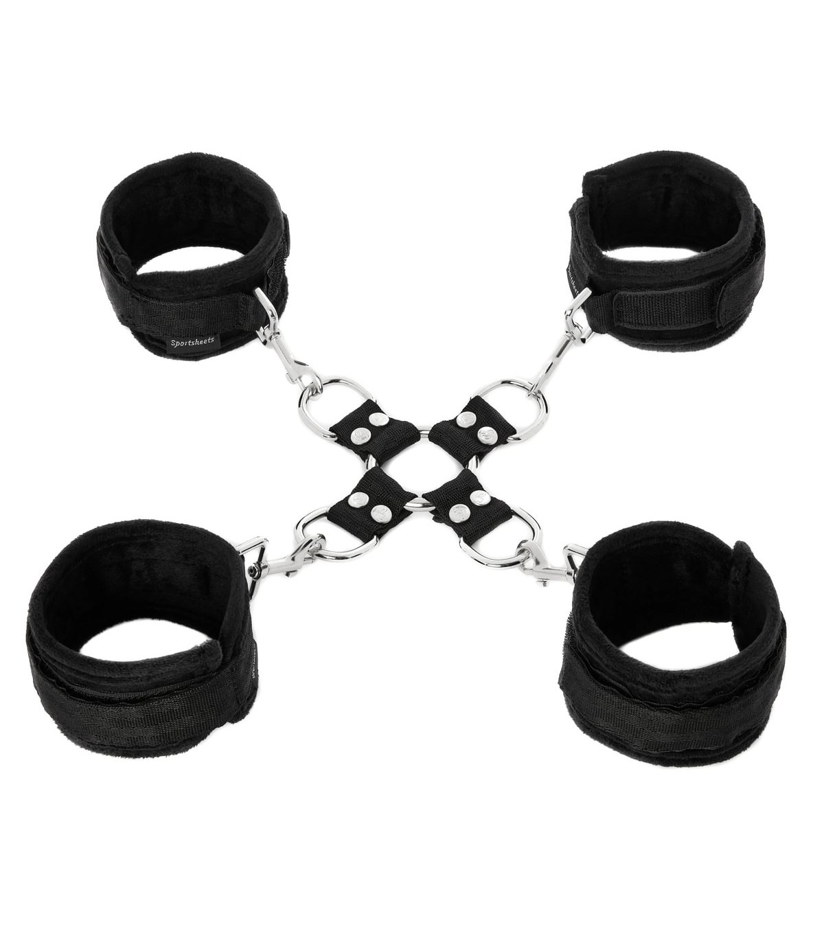 Cuatro esposas Sportsheets, resistentes y cómodas, permiten una infinidad de posiciones, limitadas solo por tu mente sucia. Perfecto para principiantes o entusiastas del bondage con experiencia, este set sin cuero incluye el conector central para la atadura y cuatro esposas desmontables. Fabricadas con herrajes resistentes, cada gancho se engancha fácilmente a las anillas en D de la atadura. Alternativamente, las esposas ajustables con cierre de velcro pueden usarse por sí solas como esposas y esposas para tobillos. El set de 5 esposas para ataduras y esposas puede usarse por delante o por detrás, según lo que tengas en mente para la noche. Resistente y fácil de quitar, este producto crea formas rápidas y fáciles de sujetar a tu pareja.