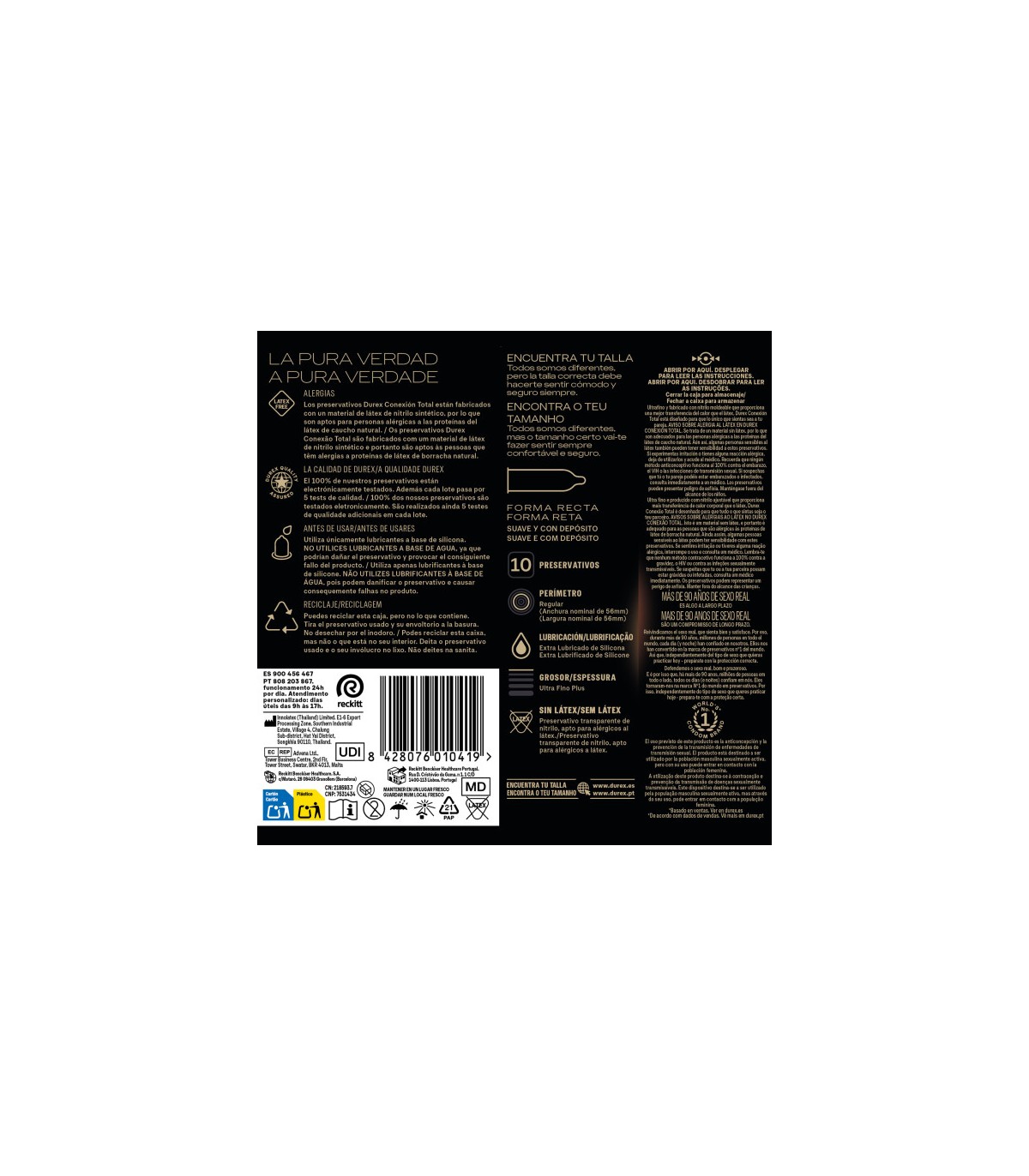 Ultrafino y fabricado con nitrilo moldeable que proporciona una mejor transfarencia del calor que el látex. Durex Conexión Total está diseñado para que lo único que sientas sea a tu pareja. Aviso sobre alergia al látex en durex Conexión total. Se trata de un material sin látex, por lo que son adecuados para las personas alérgicas a las proteínas del látex de caucho natural. Aún así, algunas personas sensibles al látex también pueden tener sensibilidad a estos preservativos. Si experimentas irritación o tienes alguna reacción alérgica, deja de utilizarlos y acude al médico. Recuerda que ningún método anticonceptivo funciona al 100% contra el embarazo, el VIH o las infecciones de transmisión sexual. Si sospechas que tú o tu pareja podéis estar embarazados o infectados, consulta inmediatamente a un médico. Los preservativos pueden presentar peligro de asfixia. Manténgase fuera del alcance de los niños.