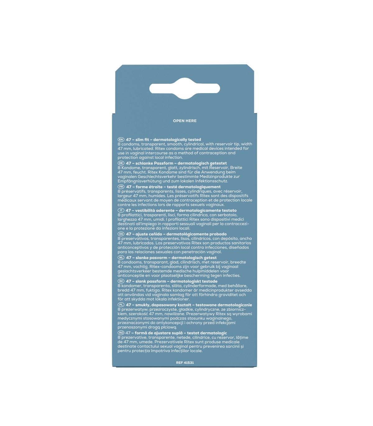Con una circunferencia de 94 mm, en lugar de los 106 mm de los preservativos estándar Ritex, los preservativos Ritex "47" ofrecen una sensación especialmente segura, especialmente para penes delgados. Su ajuste firme y agradable proporciona una sensación intensa. El nombre "47" se deriva del ancho del preservativo en posición horizontal (=media circunferencia).