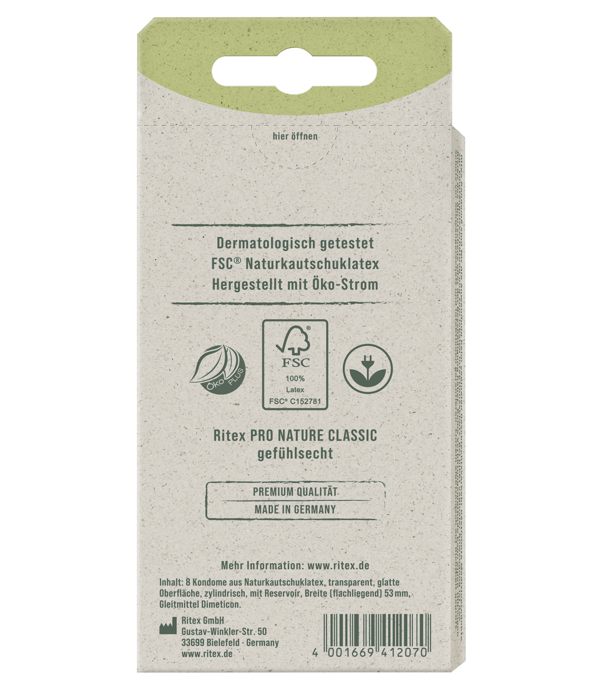 Acércate a lo más natural del mundo. Confía en tus sensaciones con los nuevos preservativos Ritex PRO NATURE. Fabricados con látex de caucho natural procedente de cultivos ecológicamente sostenibles y con electricidad verde según el estándar EKOenergy. Además, cuentan con un embalaje ecológico y mucho cariño.