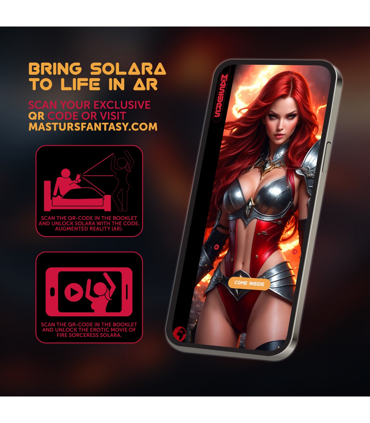 - Realidad Aumentada (RA): Utiliza los códigos QR exclusivos para invocar a Solara directamente en tu dormitorio. Mírala aparecer ante ti, lista para interactuar y convertir tu espacio personal en su santuario de placer.