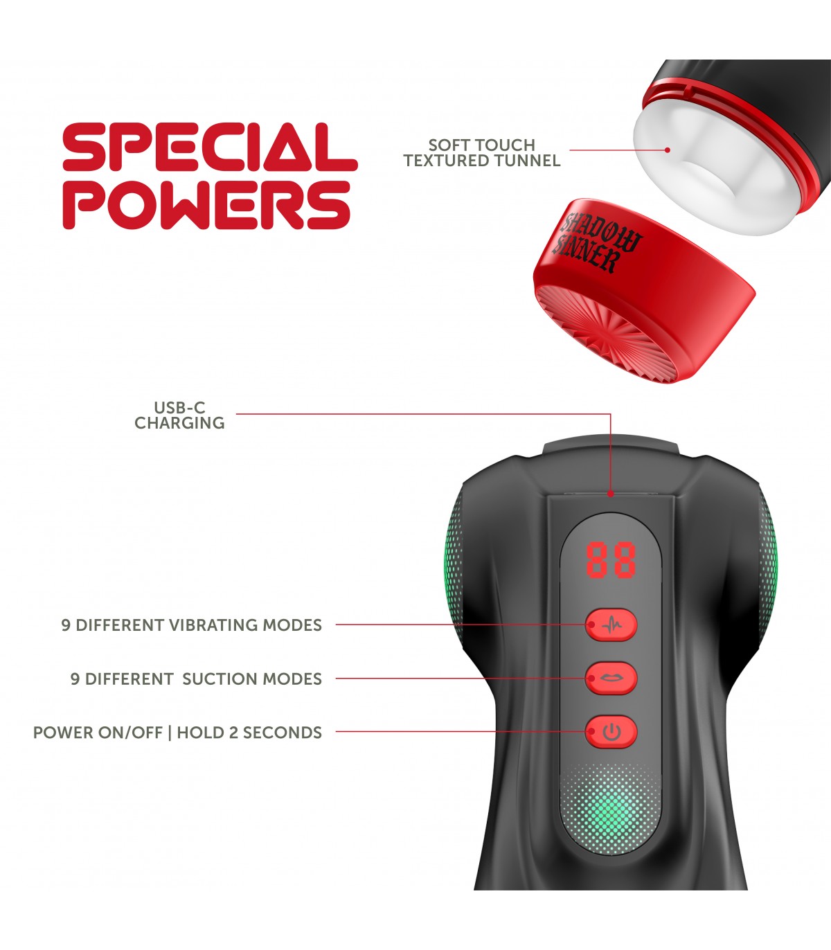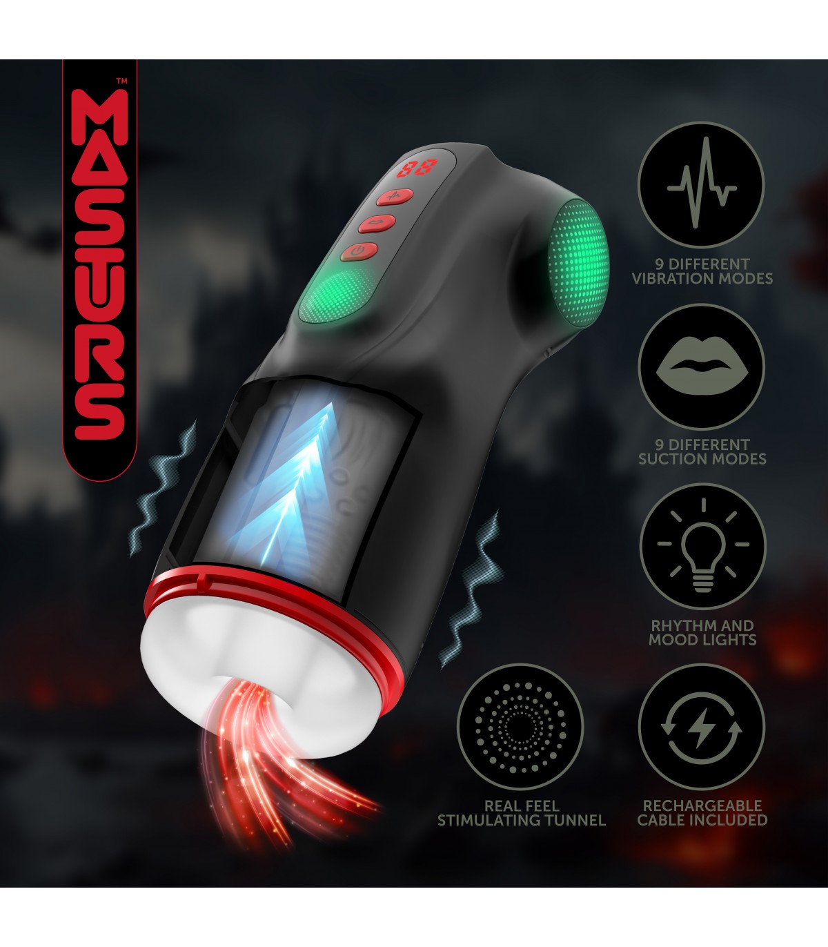 - Masturbador multifunción (Succión, Vibración y Luces).