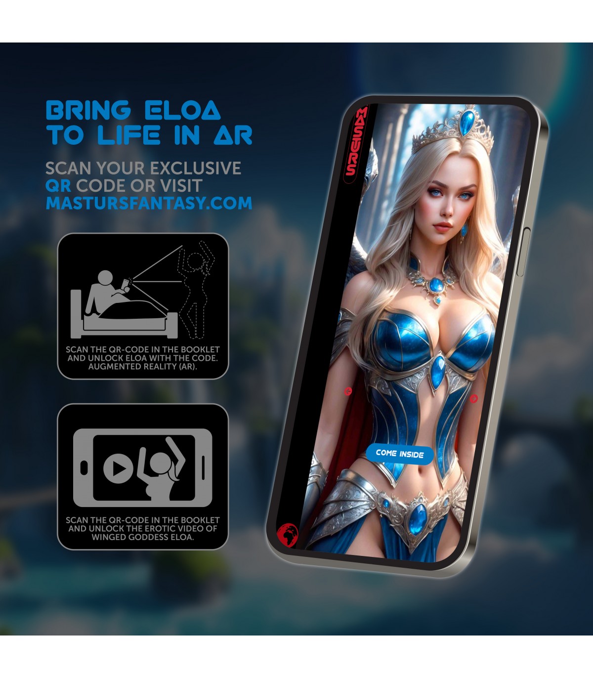 Pero eso no es todo: Eloa no solo está aquí para un encuentro físico, sino que te invita a unirse a ella en una experiencia de realidad aumentada (RA). A través de los códigos QR exclusivos que se incluyen con tu compra, podrás ver a Eloa aparecer en tu habitación, elegantemente vestida y lista para jugar, como una aparición deslumbrante. O bien, puedes verla en una película sensual, viajando entre nubes celestiales y en su majestuoso castillo blanco, todo mientras se desliza hacia ti, esperando a elevarte al paraíso.