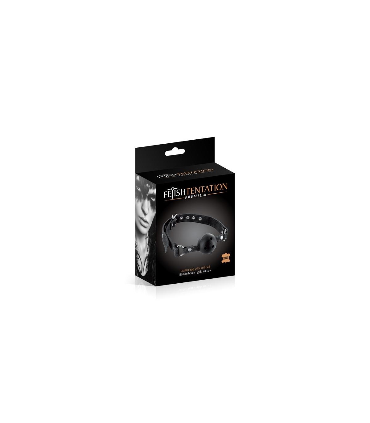 Mordaza negra transpirable presentada en caja.