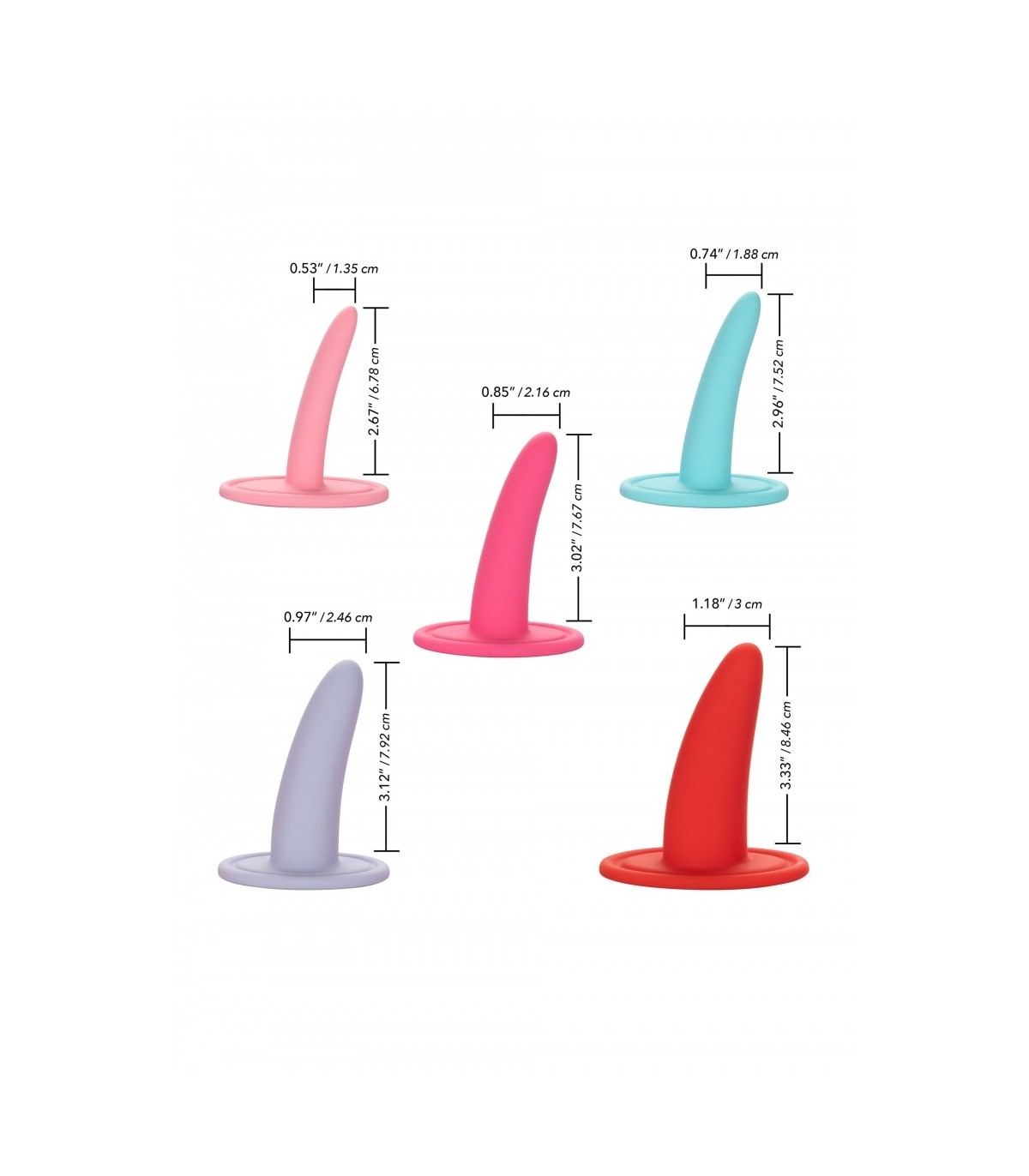 Set de 5 dilatadores ergonómicos intravaginales de diversas tallas y diámetros para ejercitar y progresivamente dilatar el canal vaginal.