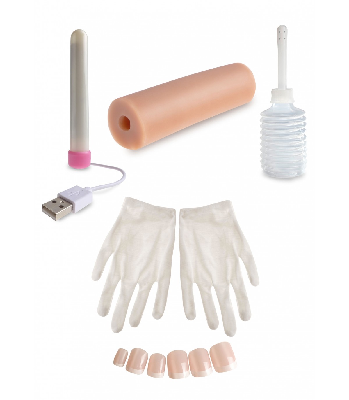 Incluye: guantes, 2 mangas masturbadores, irrigador para su limpieza, juego de uñas de repuesto, calentador de juguetes, lubricante, limpiador de juguetes y polvos regeneradores.