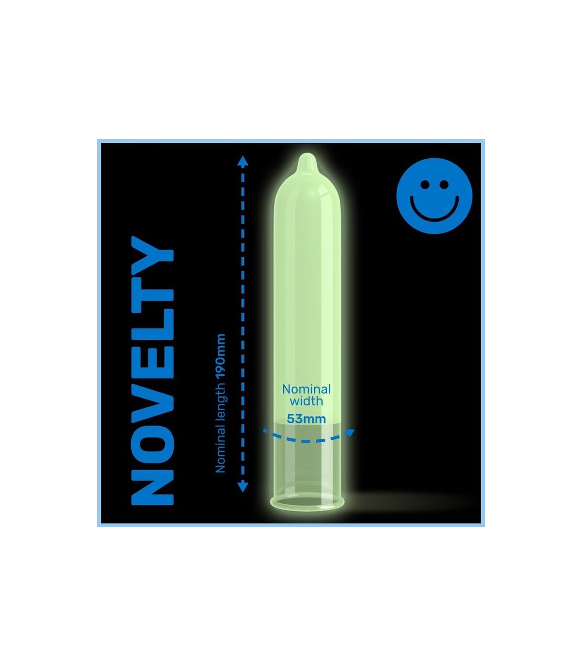 Los condones Pasante Glow brillarán en la oscuridad después de haber sido expuestos a la luz. Lisos, paralelos y con puntas en los pezones.
