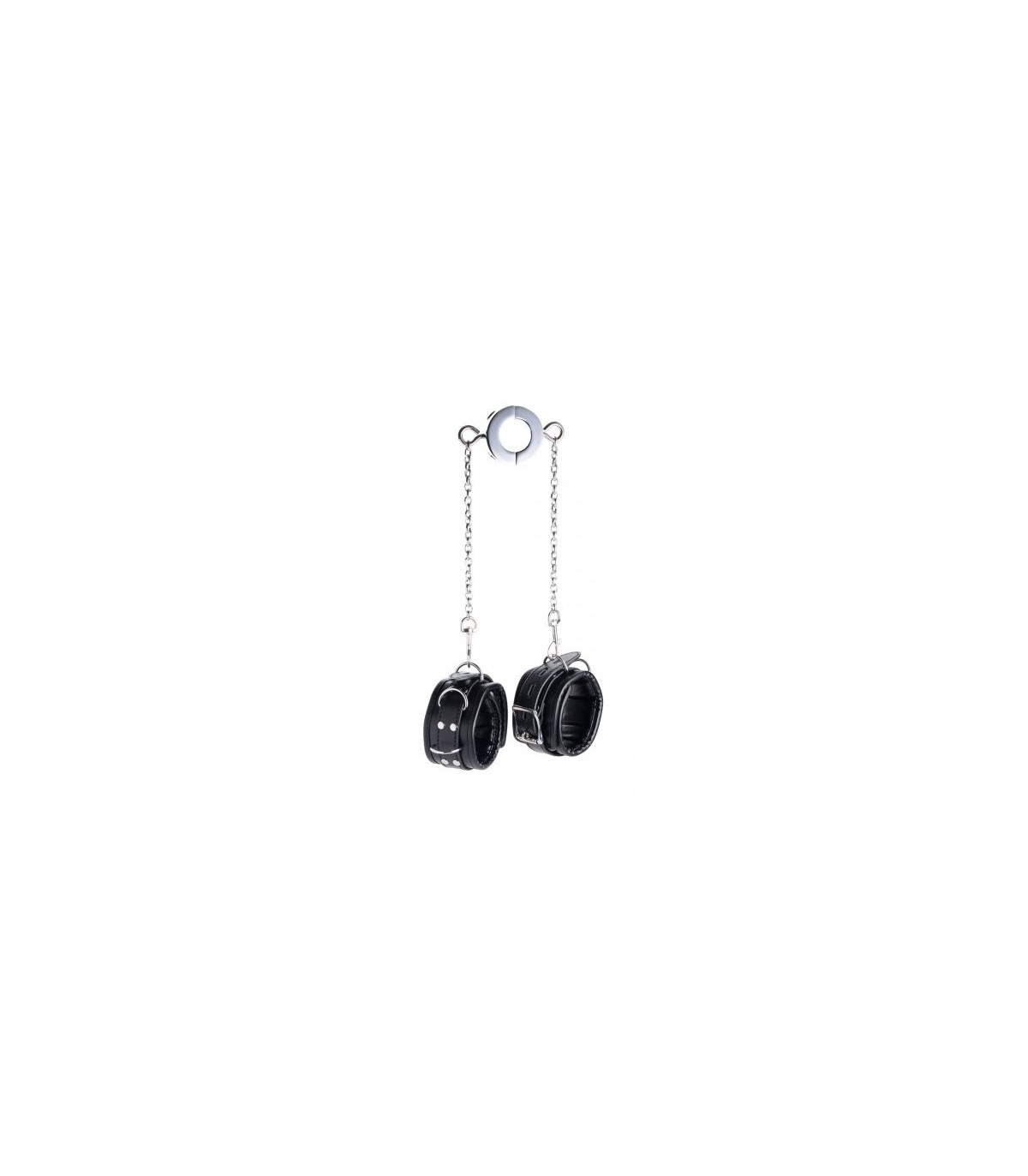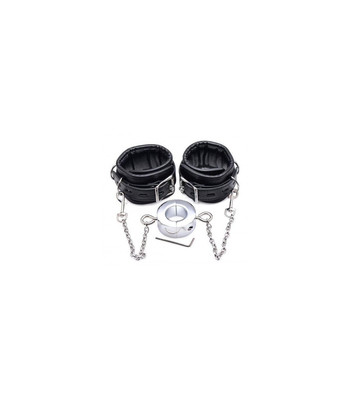 Coloca los testículos en el interior del anillo y sujeta los tobillos a las esposas y tendrás una inmovilización perfecta.