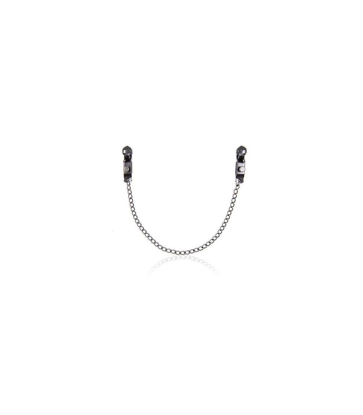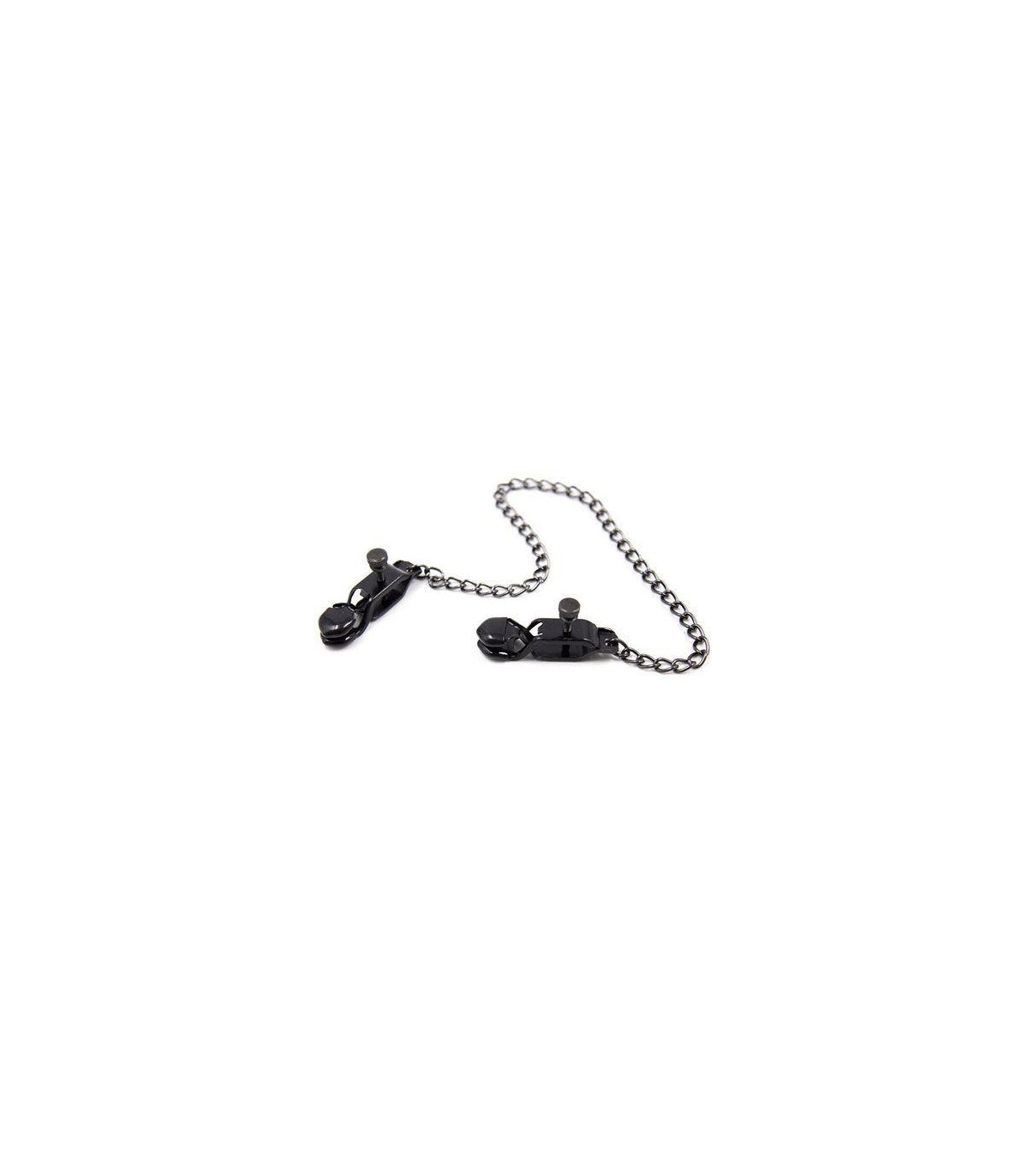 Pinzas para pezones con presión regulable unidas por cadena metálica. Para entusiastas del BDSM pero también para principiantes que deseen añadir una cantidad extra de pasión y excitación a la relación sexual.