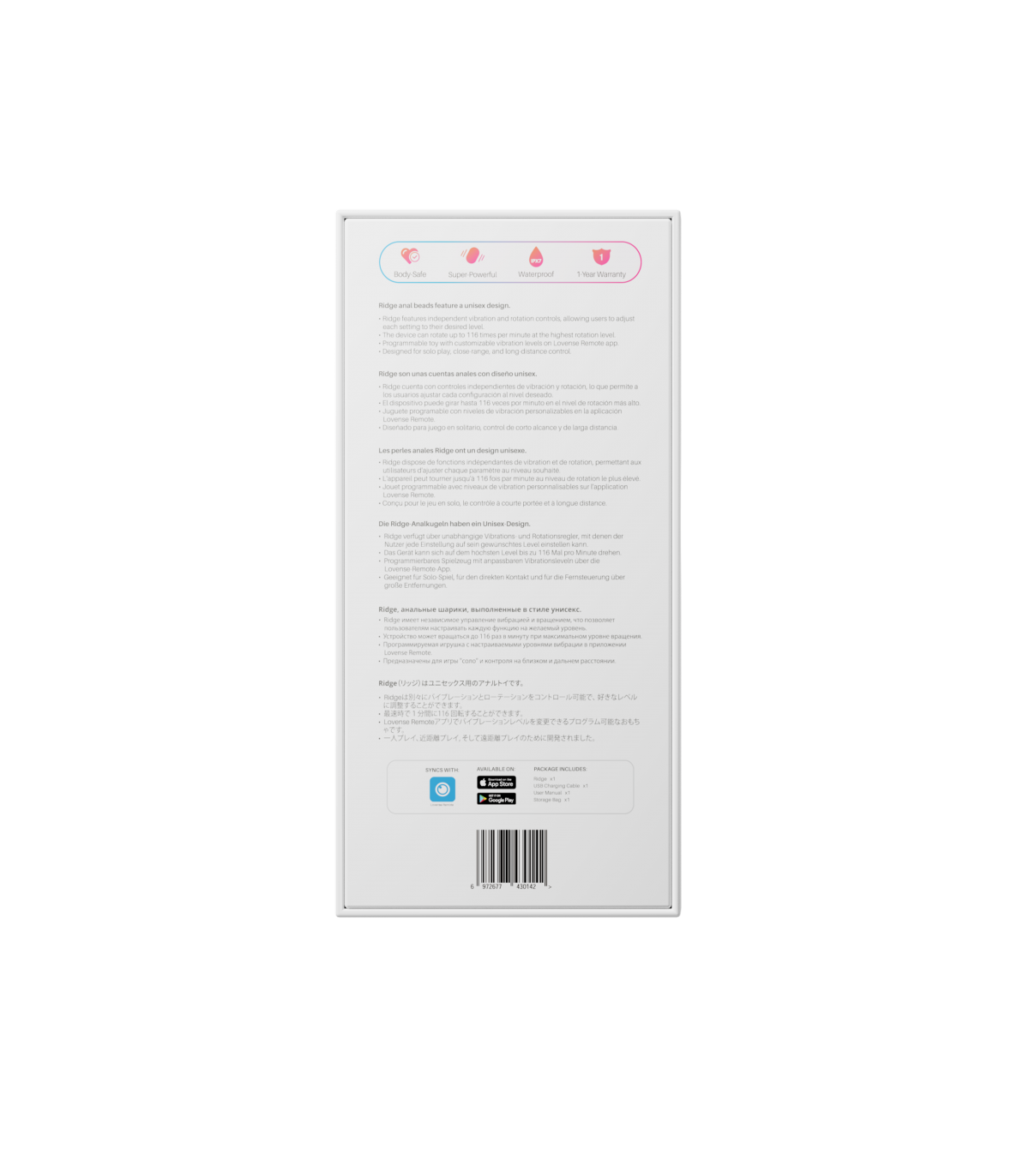 Ridge offre de fortes vibrations et un mouvement de rotation allant jusqu'à 116/min. Contrairement aux autres perles anales, il s'agit bien plus qu'une simple vibration de remplissage, des stimulations supplémentaires des zones érogènes pour un plus grand point culminant.
