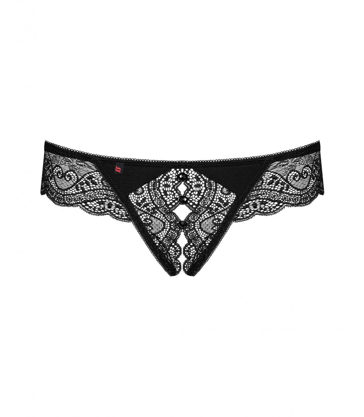 String noir de la collection Miamor à la coupe très audacieuse. La dentelle délicate ajoute de l'élégance et épouse magnifiquement le corps. Les ornements bijoux sur le devant sont un élément de charme et la coupe féminine souligne parfaitement les formes. L'entrejambe ouvert ajoute du piquant et incite au plaisir.