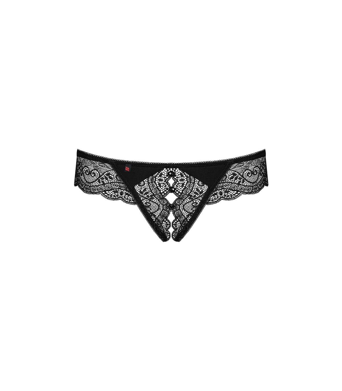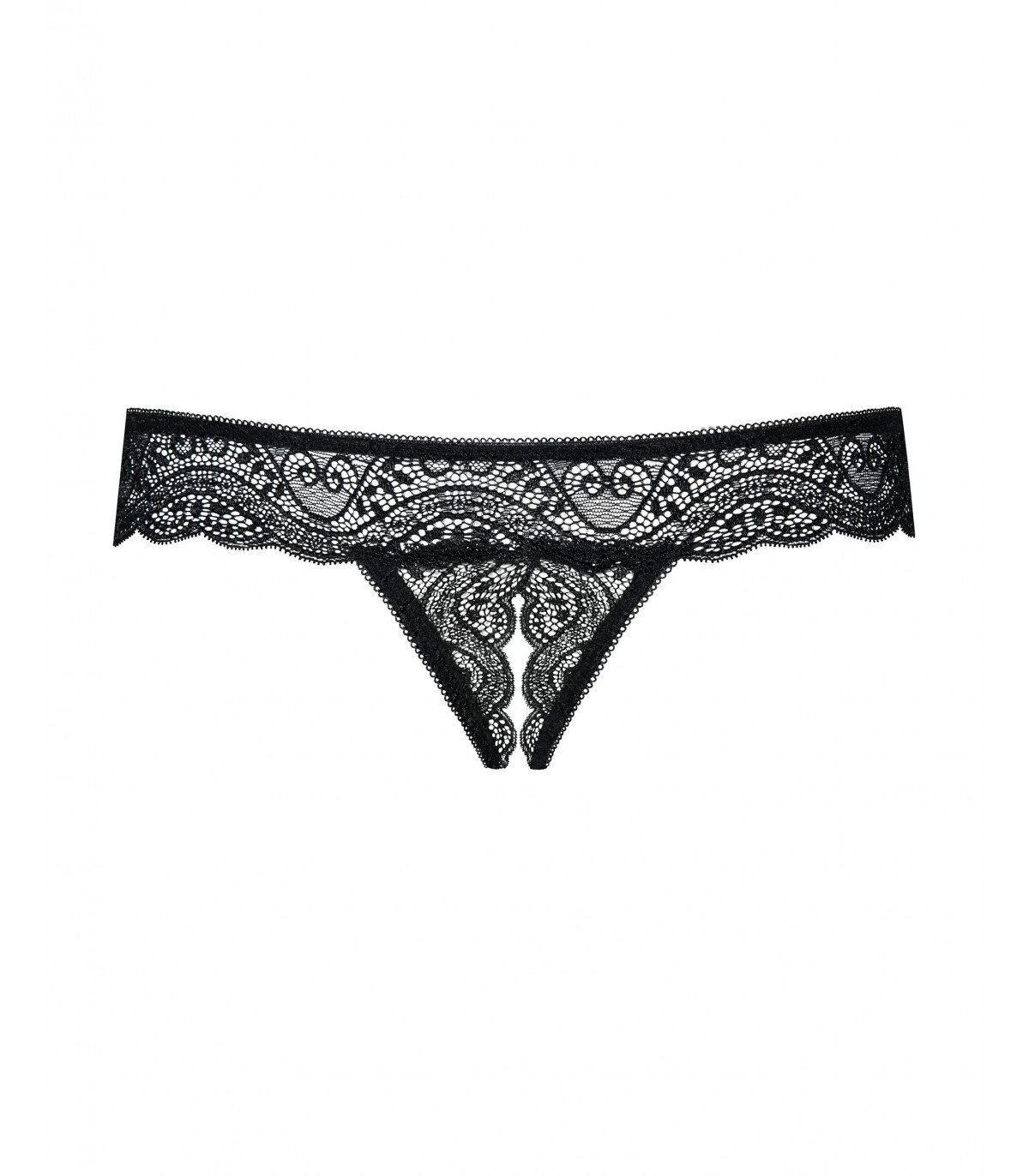 String noir de la collection Miamor à la coupe très audacieuse. La dentelle délicate ajoute de l'élégance et épouse magnifiquement le corps. Les ornements bijoux sur le devant sont un élément de charme et la coupe féminine souligne parfaitement les formes. L'entrejambe ouvert ajoute du piquant et incite au plaisir.