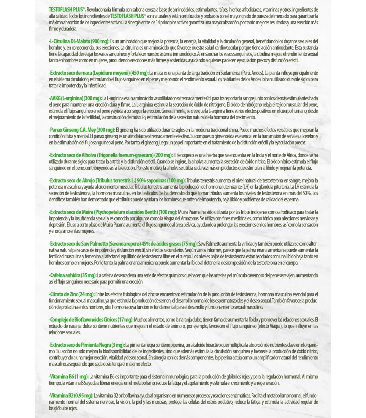 L'effet le plus important se produit dans les 6 à 8 heures suivant l'ingestion du produit, bien que TESTOFLASH® reste dans le sang pendant 24 à 36 heures.