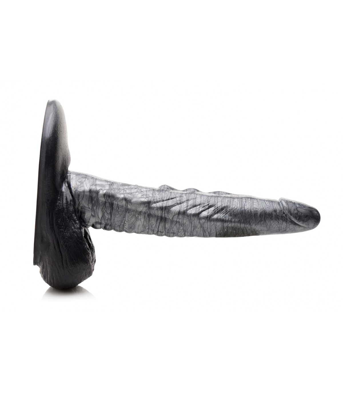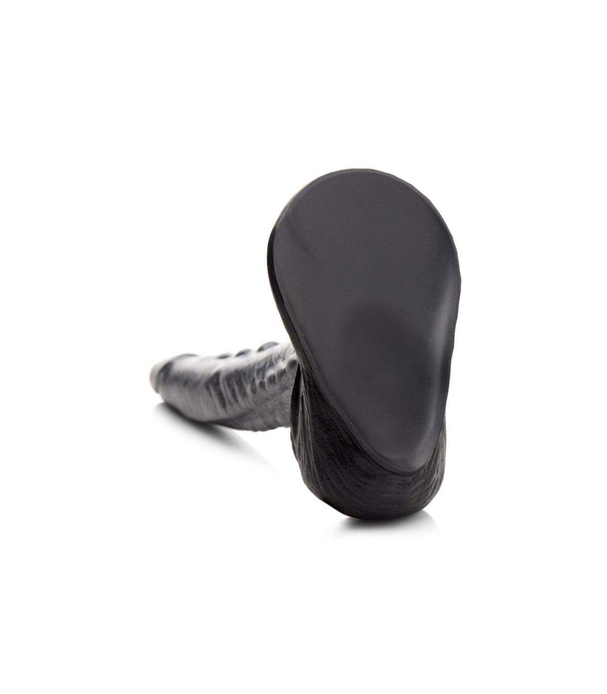 This radioactive reptile dildo is thick and scaly. The metallic green color and black base help create the perfect fantasy role-play setting for any dragon, reptile, or crocodile scene. The wide, ridged base is harness-compatible so you can pair it with a strap-on harness, and the bottom has a suction-cup base for hands-free riding. Use only with water based lubricant. Made from premium silicone, it's body-safe and phthalate-free.