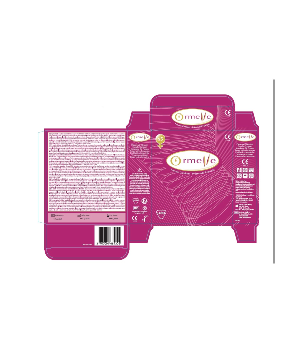 - DIMENSIONS: ORMELLE offers a universal female condom designed to meet the needs of a wide range of women. Length: 145-165 mm - Width: 75 ± 2 mm. Single-use internal condom.