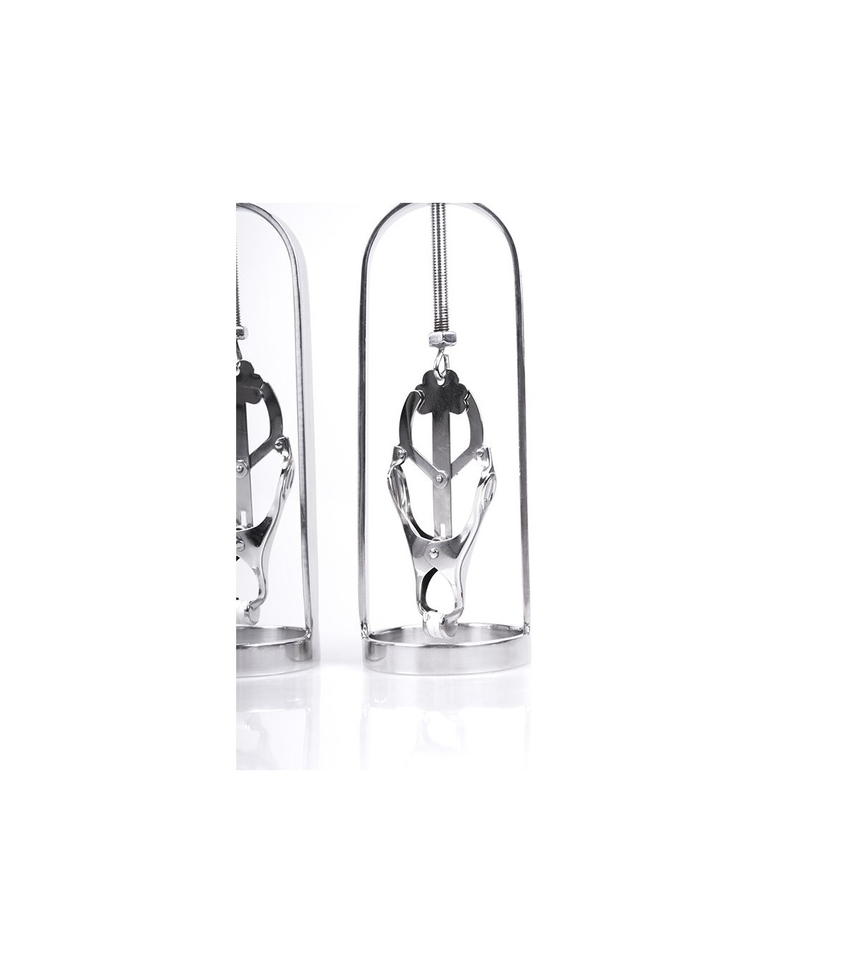 This is a small tortuous device consisting of a steel ring that sits around the nipple with a steel frame that houses a cloverleaf nipple clamp and screwing device. Once fitted, it is the tension on the nipple being pulled that holds it in place, while slowly turning the dial will pull and stretch the nipple to achieve the desired effect. The clamps are removable, allowing you to use your own favorite clamps or similar ones.