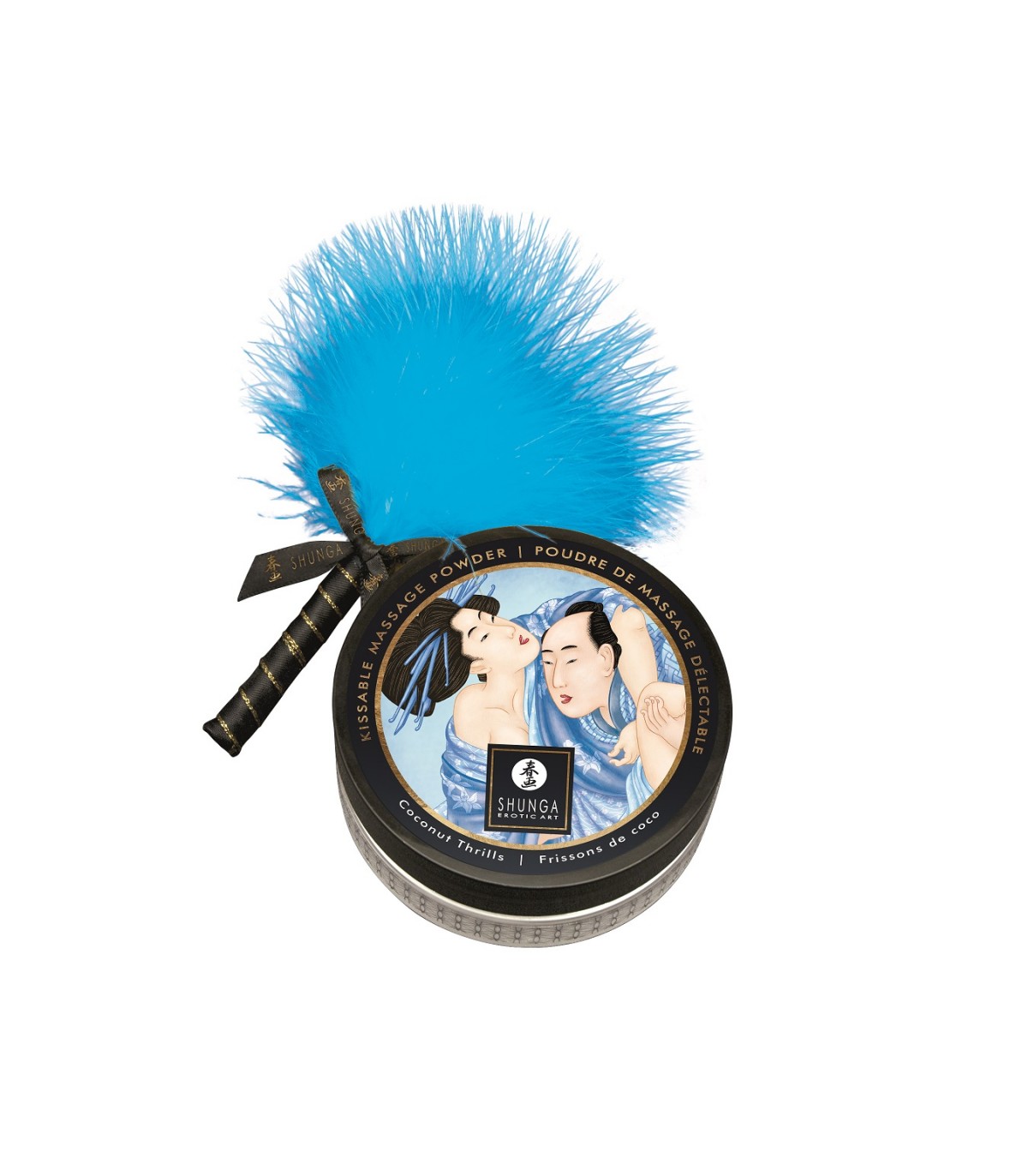 Le accattivanti confezioni regalo includono uno spolverino abbinato con un nastro nero su cui è ricamato il logo Shunga in oro.