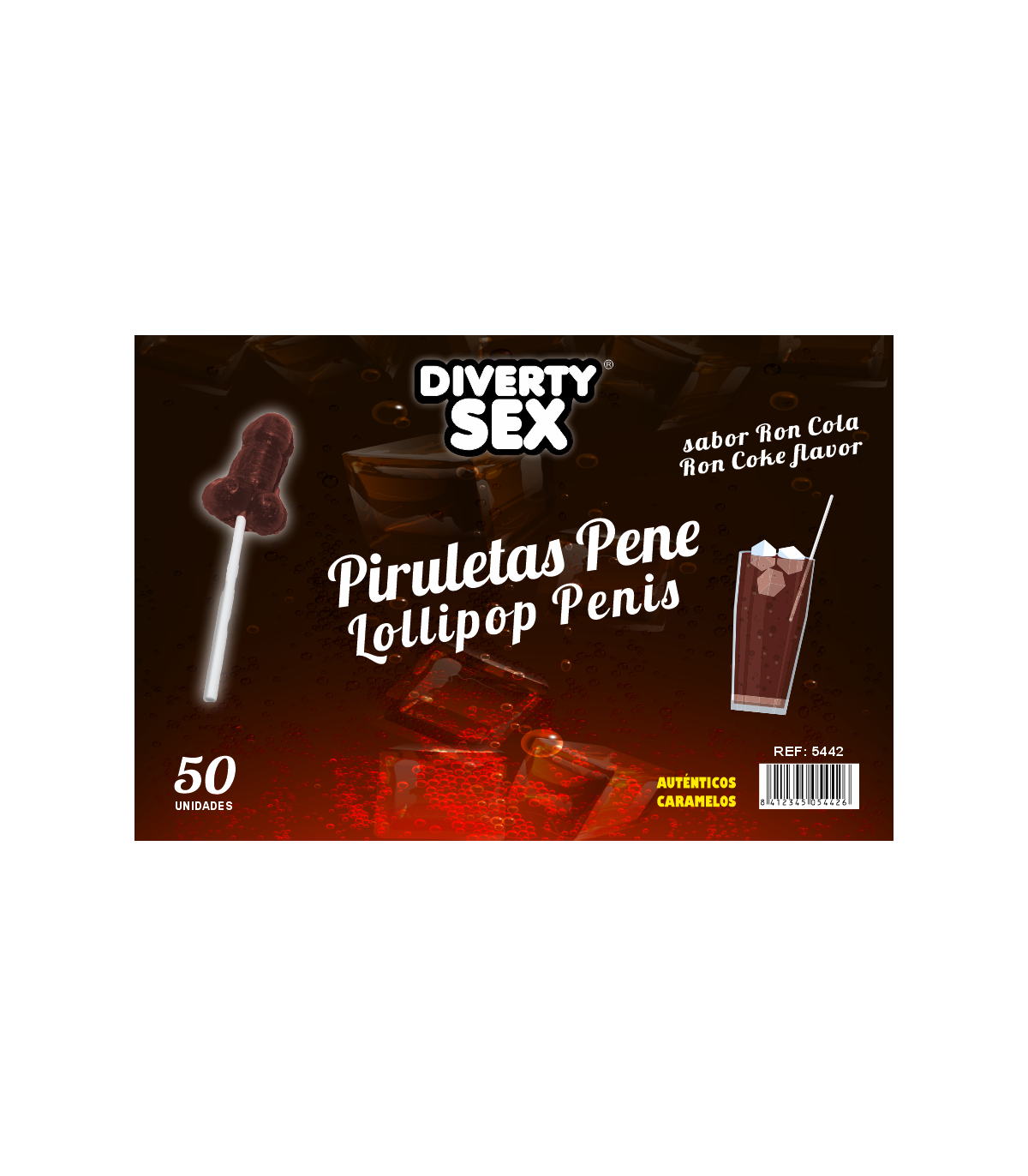 BARATTOLO ESPOSITIVO CON 50 LECCA-LECCA DI CARAMELLE A FORMA DI PENE CON GUSTO RUM E COLA AL 10% DI ALCOOL. 5 cm più il bastoncino da 13 grammi di colore MARRONE CHIARO. Delizierà i palati più esigenti. È l'ideale per mangiare con gli amici, per passare dei bei momenti o come regalo per qualsiasi occasione. PROVATEMI, NON VE NE PENTIRETE! DOLCE CON GRAZIA NON FA MALE. LASCIATE LIBERA LA VOSTRA IMMAGINAZIONE.