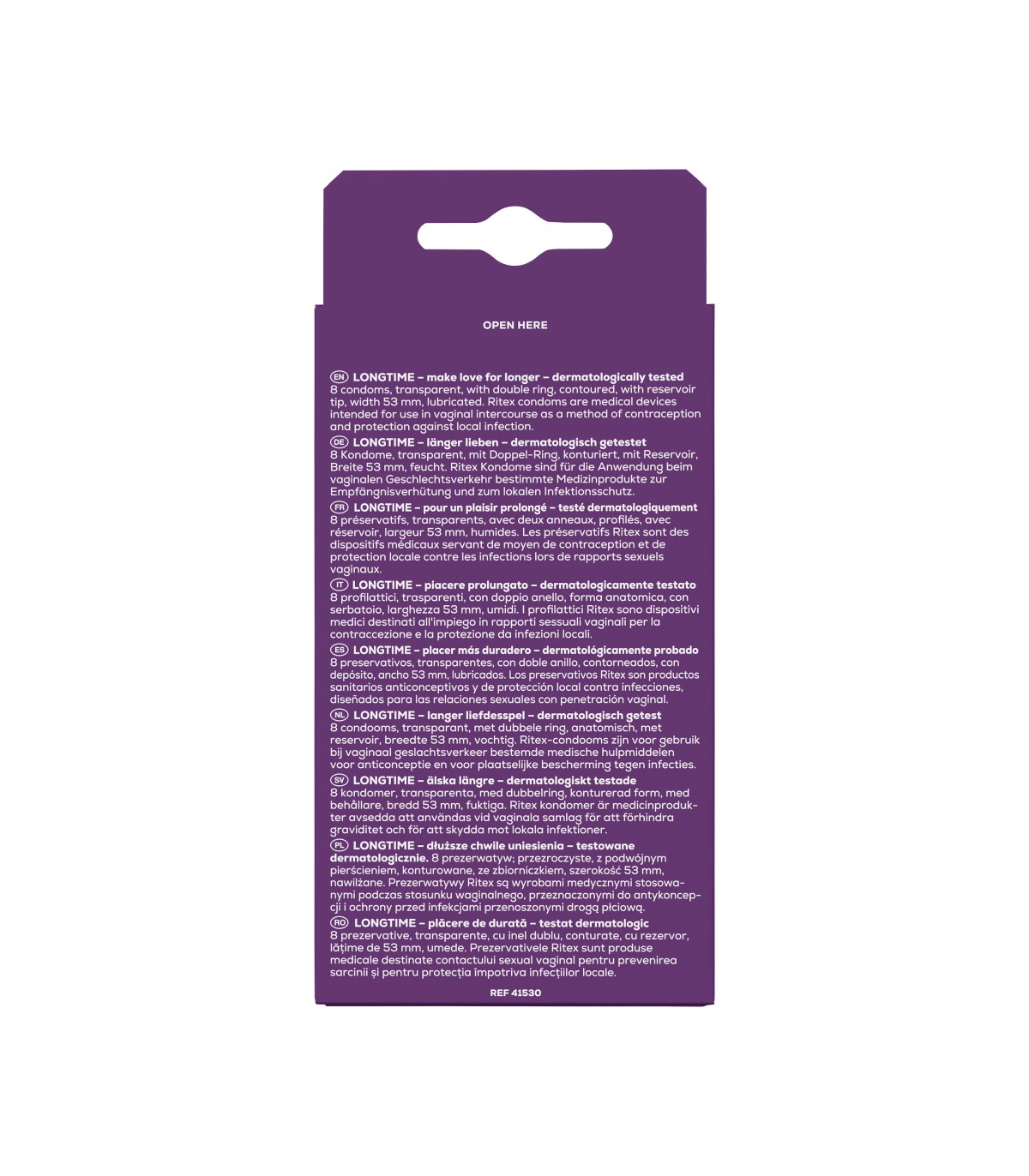 I preservativi Ritex LONGTIME hanno una vestibilità anatomica con doppio anello per un'esperienza sessuale extra lunga.